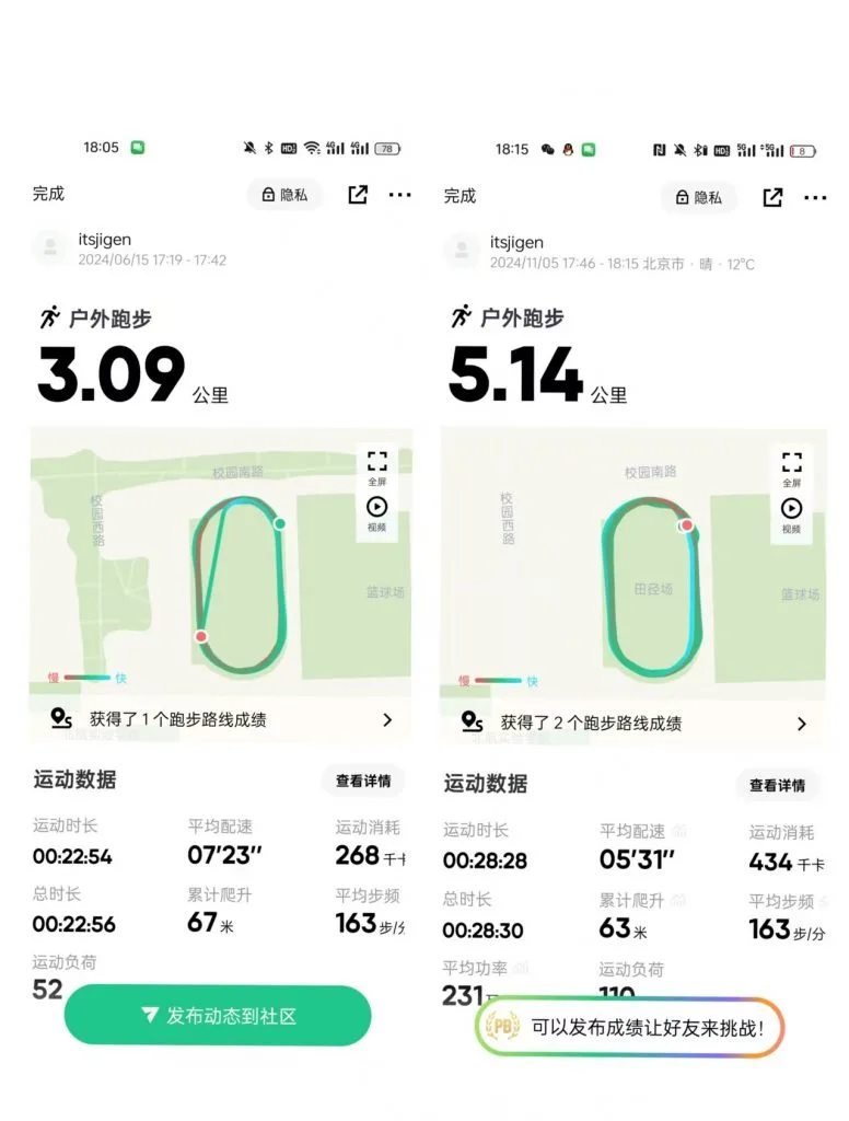 重塑健康生活习惯的契机始于2023年底入选校瑜伽队。这是我自2021年因踢球导致右踝韧带断裂后第一次在体育活动中获得如此强烈的正反馈。随后的直接原因来自于我的朋友“肥肥”,看着他过去一年从一个200斤的大胖子变成一个140斤的帅哥,我很难不想:“如果我兄弟行,那我是不是也能行?”我曾多次尝试坚持锻炼,收获了相同次数的失败,肥肥之前似乎也是如此,但他率先做出了改变。我向他事无巨细地请教了从具体方法到心理建设的各个细节,不仅是怎么做的,更是在具体过程中碰到了什么操作上和心理上的问题,又是如何重新组织、继续坚持锻炼的。相当于师傅手把手地把所有的方法,以及可能遇到的问题,以及遇到问题的思维过程和心理过程都交给我了,并且,这些经验还完全可以迁移。这在各种意义上都对我有着极其重要的意义,是一笔无比宝贵的财富。在肥肥离京前,他带我在学校操场上用7:23的配速跑了第一个三公里,陪着我制定计划,在线上陪伴监督我跑完了第一个五公里,跑完了许多个五公里,其中最佳配速是5:31。最终,我的体重与峰值相比,瘦了二十五斤。尽管过年估计又胖了不少,但这并不意味着我的尝试失败了。肥肥还告诉我一个深刻的道理:每一次锻炼的效果,都会真实地体现在身体上。从这个角度看,我每一次尝试锻炼,都是一次成功,不是吗?